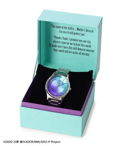 تتميز إحدى الساعتين بواجهة زرقاء داكنة وشعار وردة، مستوحاة من كيريتو ويوجيو مع عبارات من الثنائي مكتوبة على الغلاف الخلفي للساعة: “الآن قف، كيريتو. صديقي الأفضل. بطلي” و”نعم، سأقف. من أجلك، مهما استغرق الأمر.” الطراز الآخر مستوحى من أسونا ويوكي، مصمم بواجهة زرقاء فاتحة مع شعار قلب والعبارات التالية على الجهة الخلفية: “اسم المهارة هو… Mother’s Rosario. أنا متأكدة أنها ستحميك” و”شكرًا، يوكي. أعدك أنه في يوم ما، عندما يحين وقتي لمغادرة هذا العالم، سأتأكد من تمرير هذه المهارة إلى شخص ما. سيفك سيعيش إلى الأبد.”