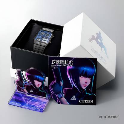 ساعة Citizen التعاونية مع Ghost in the Shell مثالية لمحبي السلسلة الضخمة، التي توسعت من المانغا إلى وسائل ترفيه متعددة بما في ذلك الألعاب والأنمي وفيلم تمثيلي حي. Ghost in the Shell SAC_2045: The Last Human يجمع حلقات الموسم الثاني من سلسلة SAC_2045 مع مشاهد إضافية جديدة، ويعرض كإصدار سينمائي في 23 نوفمبر.
